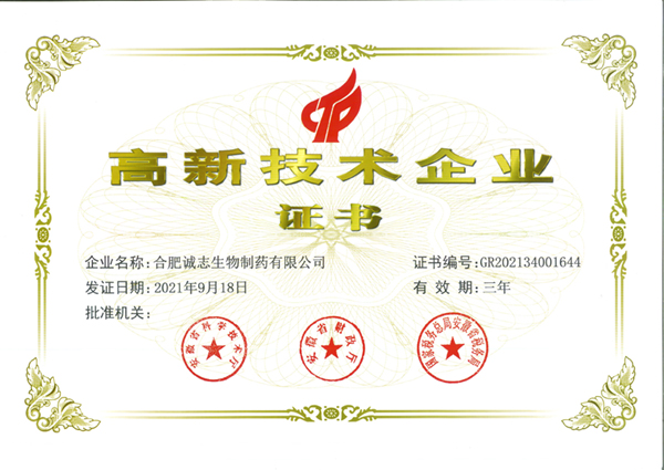 誠志生物2021年高新技術(shù)企業(yè)證書