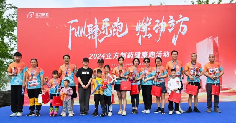 立方制藥副董事長鄧曉娟為男子競速跑、女子競速跑、雙人歡樂跑冠軍頒獎(jiǎng)